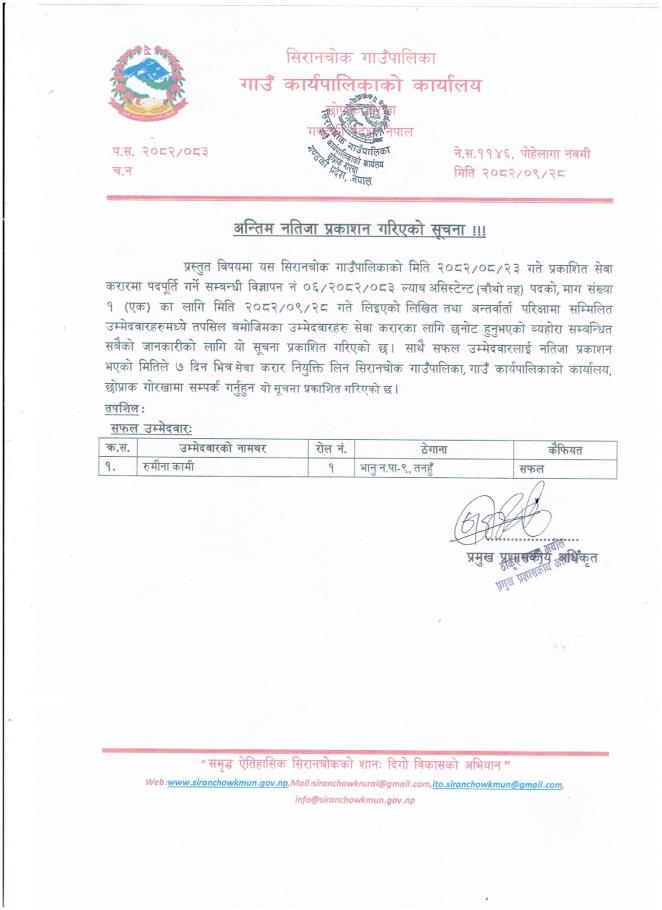 अन्तिम नतिजा प्रकाशन गरिएको सूचना ।।(विज्ञापन नं ०६/२०८२/०८३)