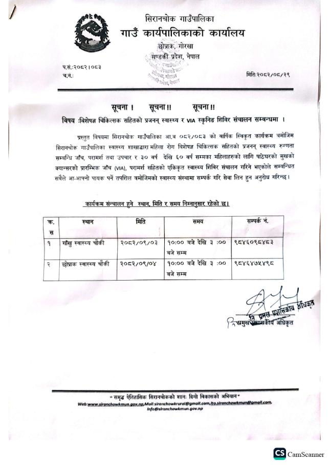 विशेषज्ञ चिकित्सक सहितको प्रजनन् स्वास्थ्य र VIA स्कृनिङ शिविर संचालन सम्बन्धि सूचना ।।
