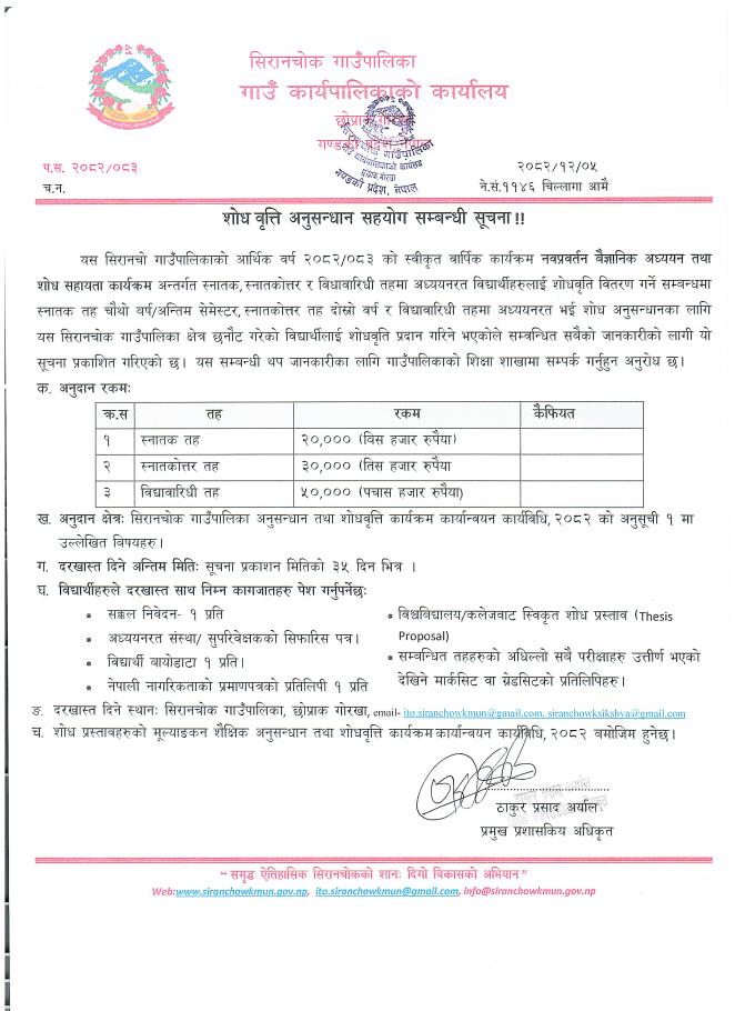 अनुसन्धान तथा शोधवृति कार्यक्रम कार्यान्वयन, २०८२ ।।