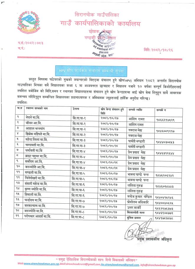 » HPV खोप कार्यक्रम संचालन सम्बन्धी सुचना ।।
