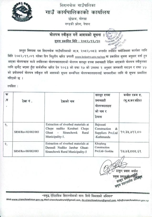 » बोलपत्र स्वीकृत गर्ने आशयको सूचना ।।