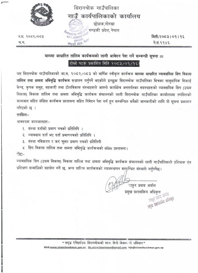 » मागमा आधरित तालिम कार्यक्रमको लागि आवेदन पेश गर्ने सम्बन्धी सूचना ।।